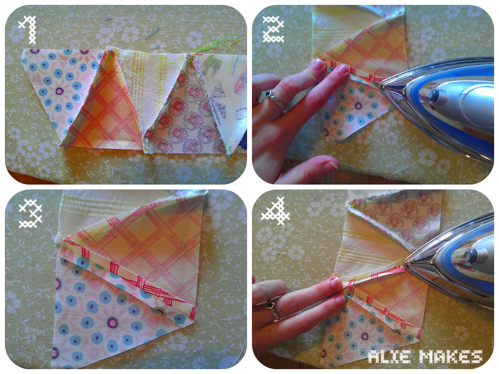 8) Open up the triangles. Proceed to sew your remaining triangles in the same way as described above, until you have finished up your row.